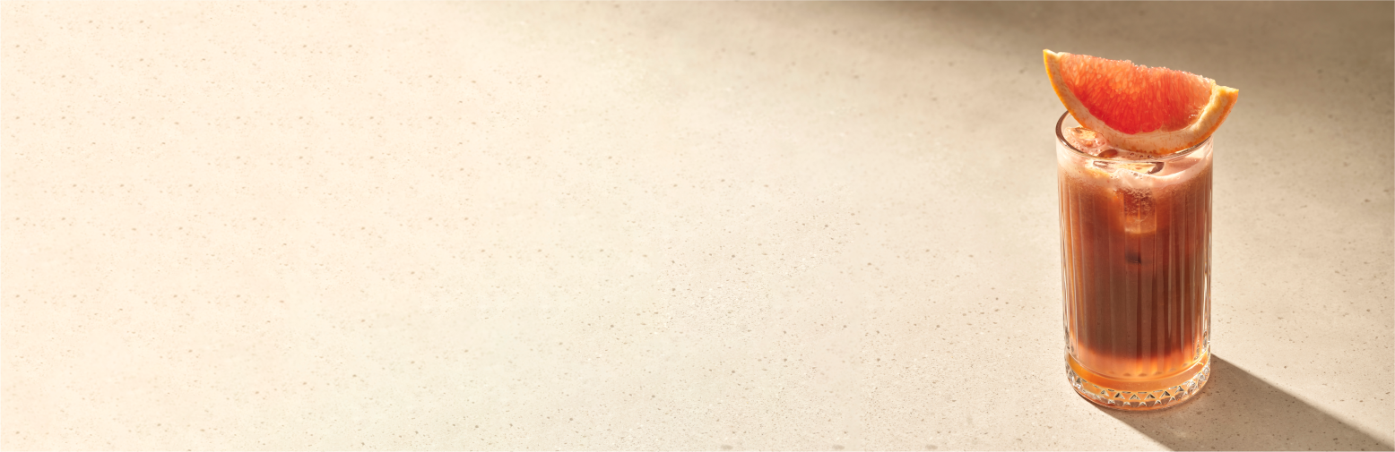 Yangi siqilgan sharbat asosida greypfrut, karamel siropi qo'shilgan ikki hissali espresso salqin ichimligi